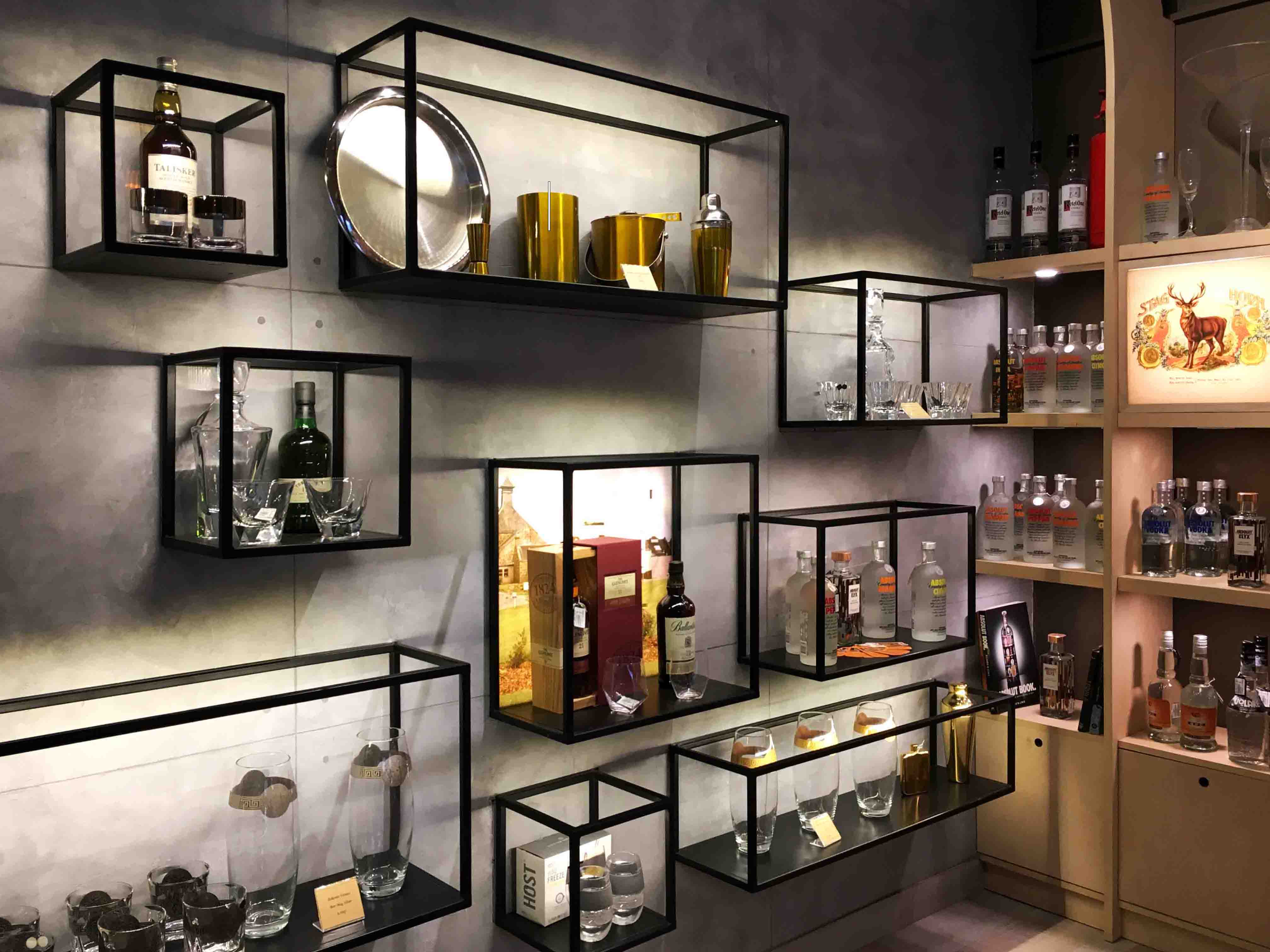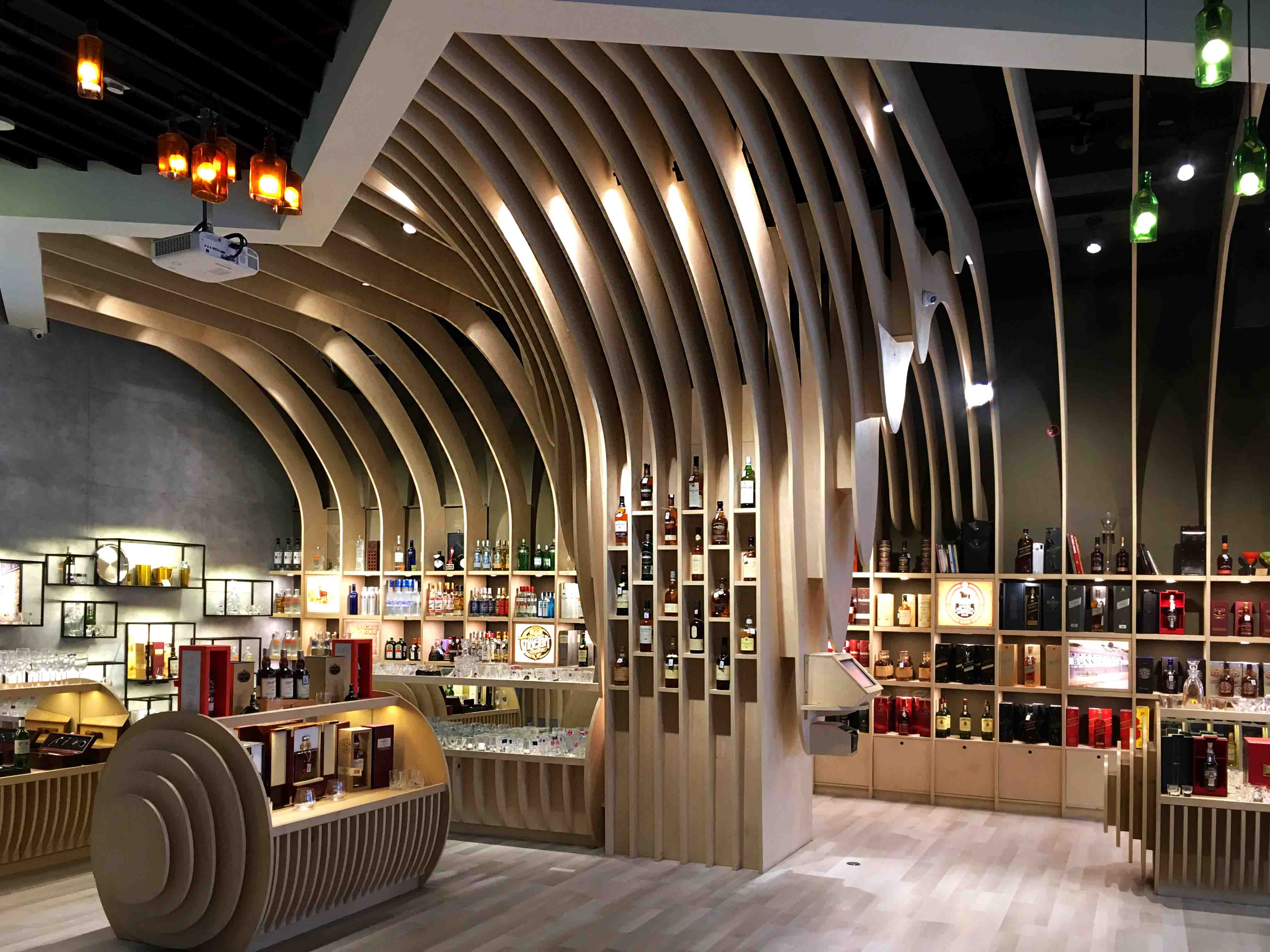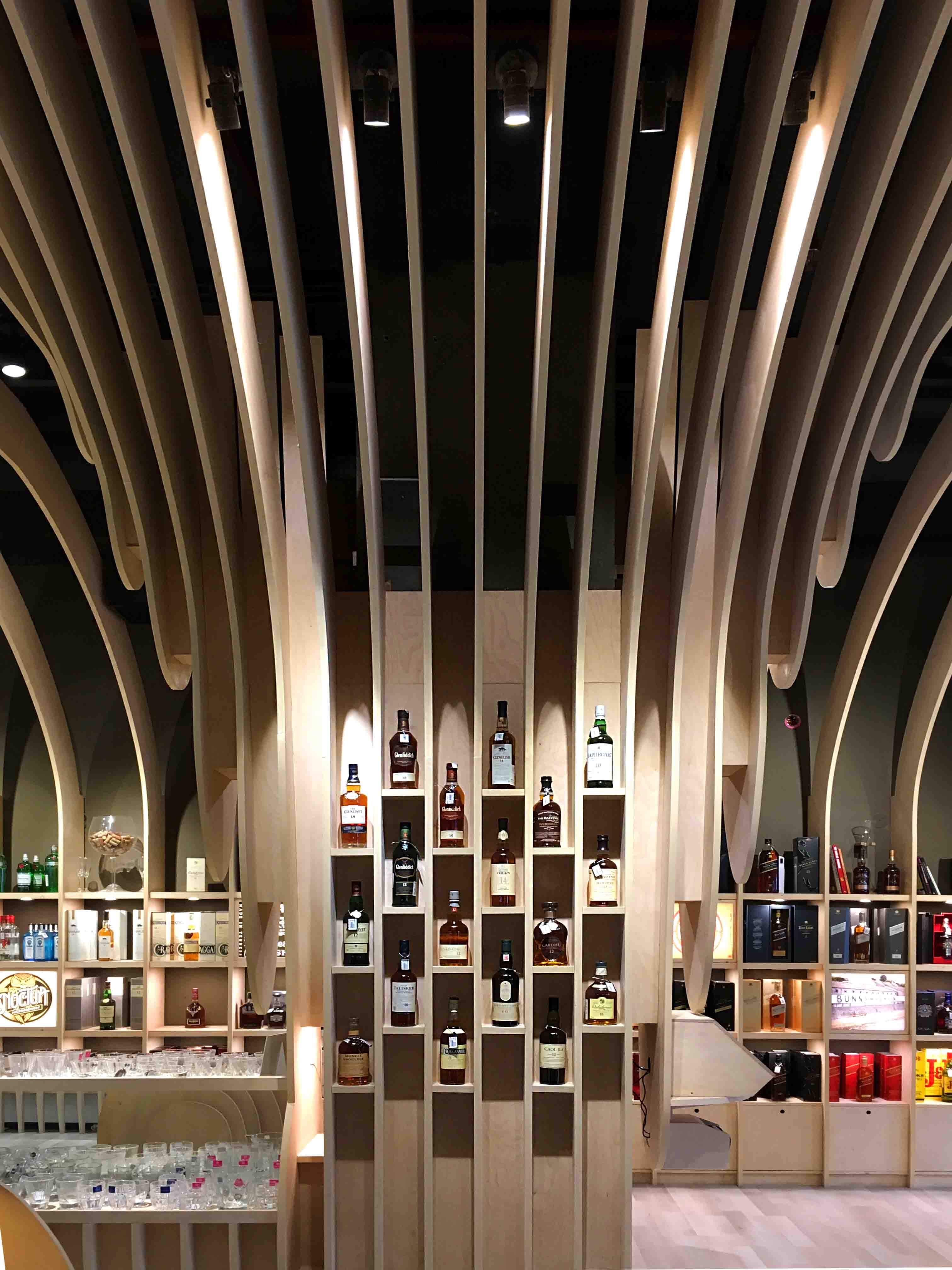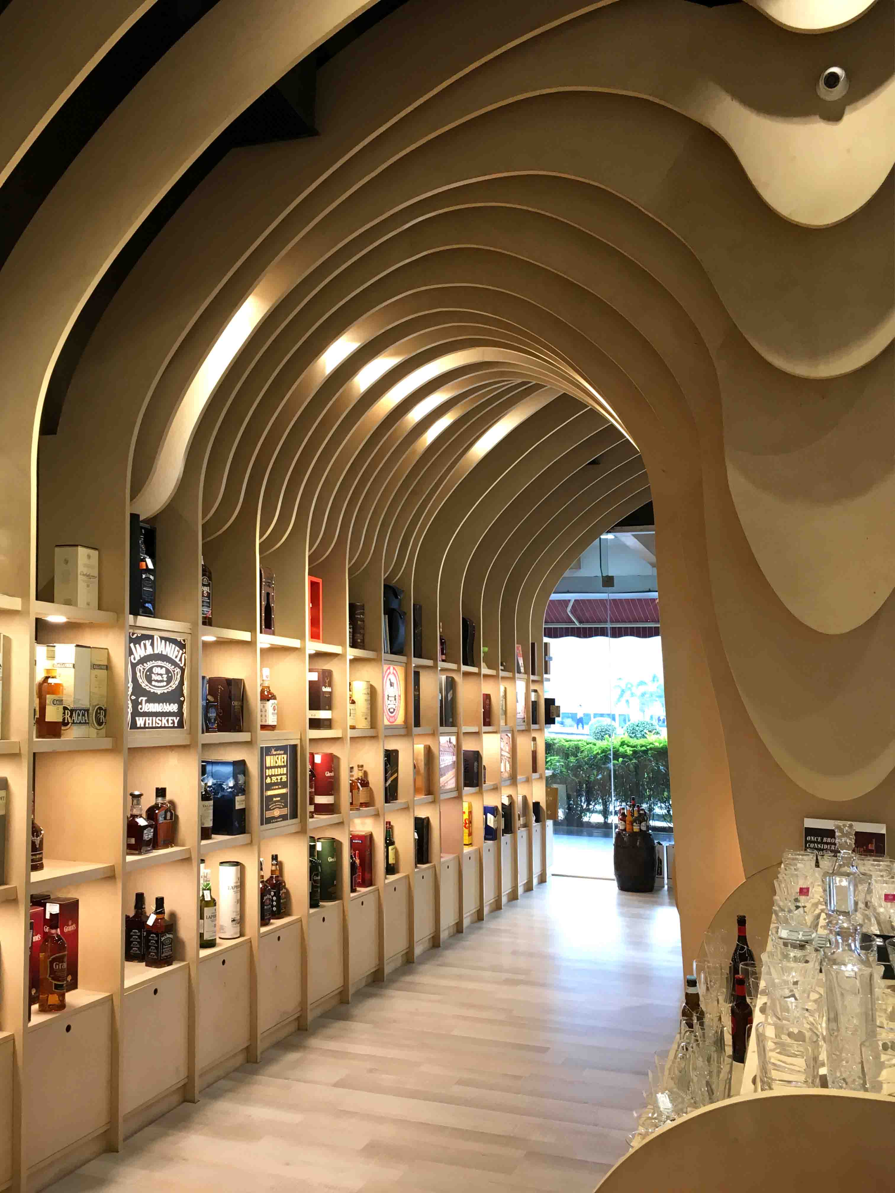 This liquor store was inspired from a supermarket in Hungary. The open ribs in exposed wood formed the structure in which the displays were integrated. Its striking look and modern feel made for it to b a dazzling attraction for the gentry of the tricity.