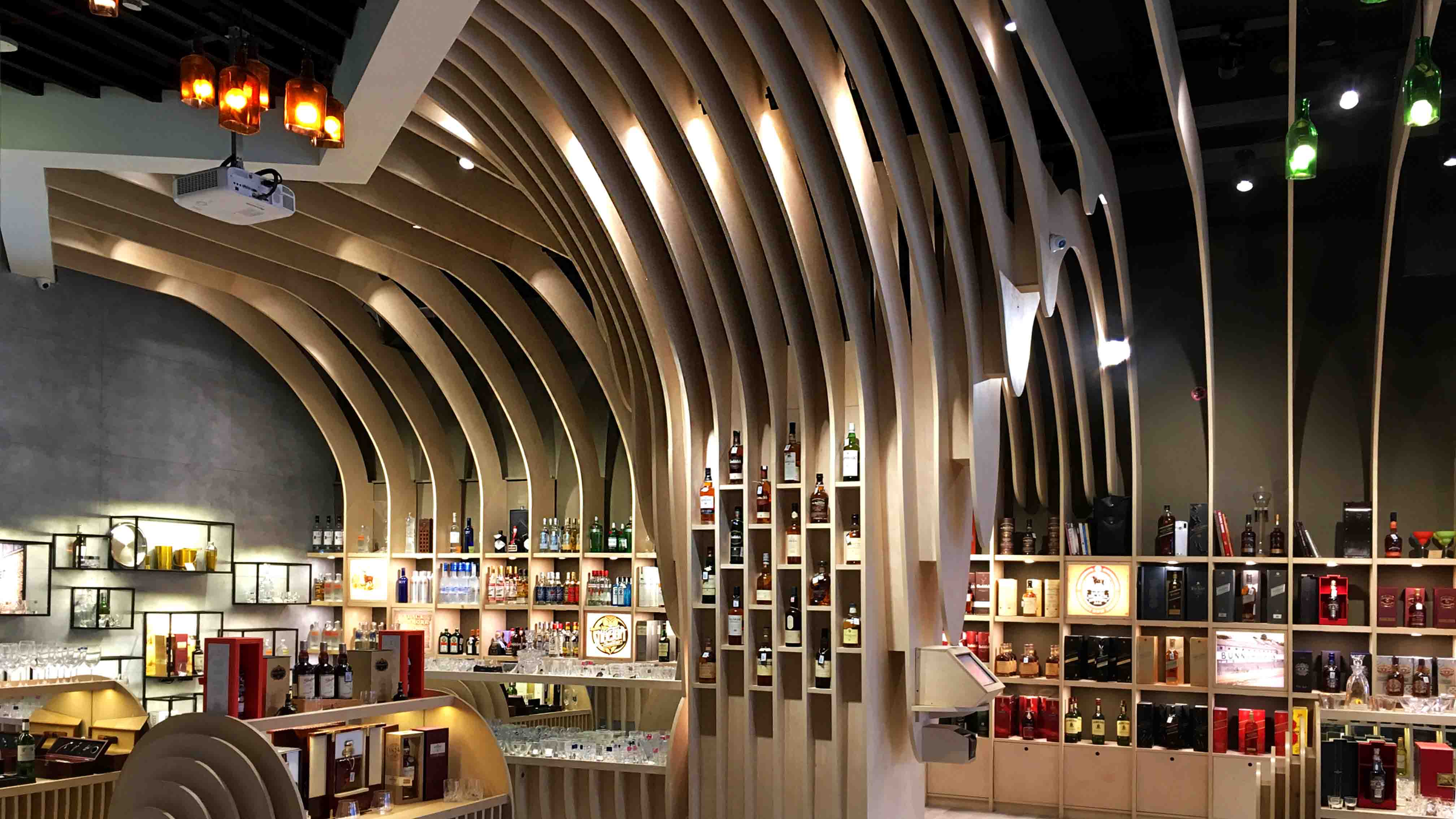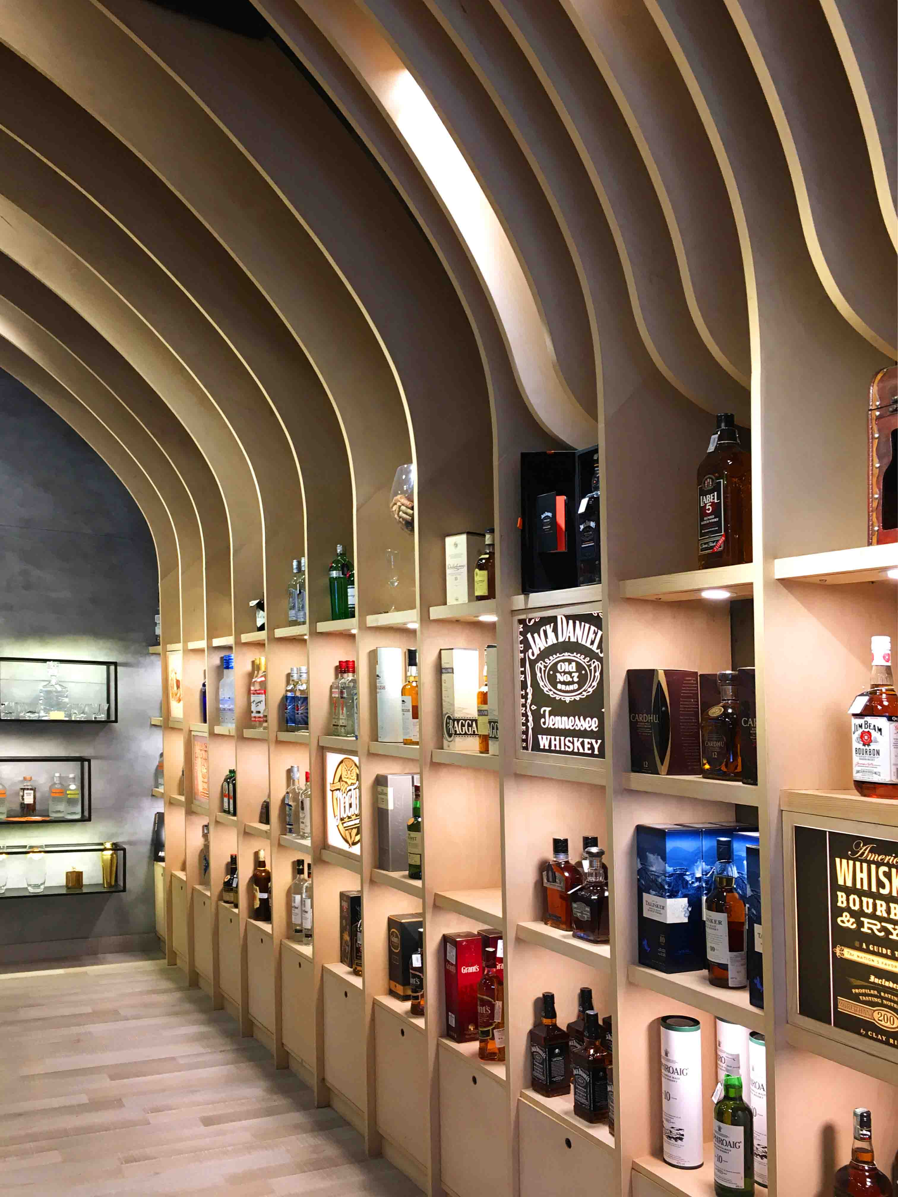 This liquor store was inspired from a supermarket in Hungary. The open ribs in exposed wood formed the structure in which the displays were integrated. Its striking look and modern feel made for it to b a dazzling attraction for the gentry of the tricity.